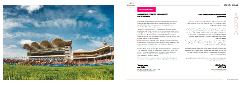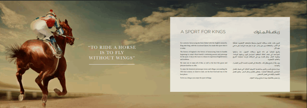 For centuries horseracing has been linked with the English monarchy.King after king, with the occasional Queen, has made this sport what it is today. this is a brocure for Hoursing please check attached Samples: